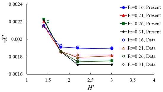 For surge forces, a reduction in non-dimensional depth () leads to an increase in surge forces, particularly when is below 2.2. This behavior is primarily attributed to the rise in wave-making resistance at shallower depths. Conversely, when exceeds 2.2, the wave-making resistance becomes negligible, resulting in minimal variations in surge force. In regions where > 2.2, the general trend of increasing resistance with higher speeds is observed. However, as H’ decreases, the influence of speed on resistance diminishes. While the effect of the free surface on the surge force weakens as surpasses 2.2, its impact on the heave force persists at greater depths, as shown in Figure 8. Unlike the surge force, the heave force remains relatively constant regardless of speed variations when the water depth increases. In other words, at greater depths, the surge force stabilizes to a constant value proportional to hydrostatic pressure. The free surface tends to exert a lifting effect on the submarine. As the submarine approaches the free surface, the fluid velocity above the hull increases relative to the velocity below the hull due to the reduced fluid volume between the hull and the free surface. This velocity difference generates an upward lift force on the hull, with the heave force reflecting the suction effect induced by this lift. As shown in Figure 8, the heave force generally increases with higher Froude numbers and lower non-dimensional depths (). However, a notable crossover occurs when < 1.8 at . This behavior is likely due to nonlinear effects in free-surface dynamics induced by higher vessel speeds.