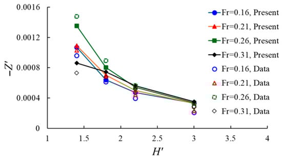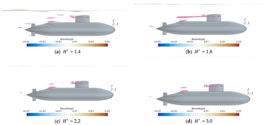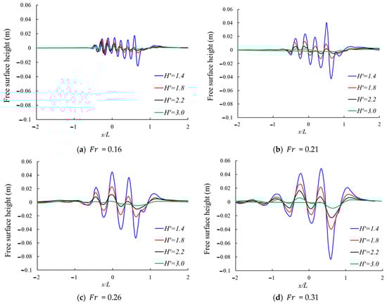Figure 10 illustrates the variation in the free surface at the = 0 plane for different depths and Froude numbers. Similarly to the wave contours presented in Figure 9, the free-surface elevation increases as H’ decreases, with a particularly significant rise observed at = 0.31. At this depth, the free surface undergoes considerable fluctuations, leading to pronounced nonlinear effects. Furthermore, as the Froude number increases, the variations in free-surface elevation become more pronounced.