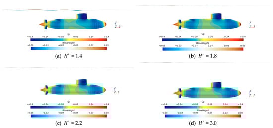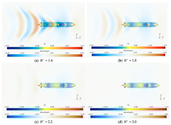 Figure 11 presents the pressure coefficient contours on both the hull and the free surface above it, as viewed from the side. The pressure coefficient distributions at the bow and stern exhibit similar trends, regardless of variations in the submerged depth. This suggests that wave-making resistance plays a significant role in influencing the surge force. In contrast, the pressure coefficient in the z-direction, which affects the heave force, shows notable differences in the midsection of the hull. As the submerged depth increases, the pressure difference between the upper and lower surfaces in this region decreases. Furthermore, the impact of depth variations becomes less pronounced at greater depths.