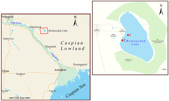 Baskunchak is a large, drainless, self-sedimenting, hypersaline lake located in the Caspian lowlands, about 270 km north of the Caspian Sea and 53 km east of the Volga River (Figure 1). The area of the lake is about 96 km2 and the length of the shoreline is 42 km. The lake stretches from northwest to southeast for 16.5 km, with a maximum width of up to 9 km. The surface of the water (brine) in the lake is 21 m below the level of the Caspian Sea. In wet periods of the year (spring and autumn), Lake Baskunchak is a “brine” lake with a maximum level of brine up to 0.7 m [19].
