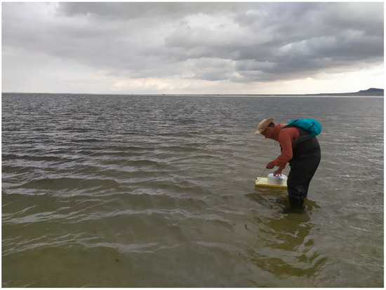 The specific flux of methane and carbon dioxide from the surface of the Lake Baskunchak brine was determined by the chamber method using accumulation chambers, specifically traps [34,35] (Figure 2). The traps are polycarbonate containers of cylindrical shape with an open base on floats made of foam for stability on the water.