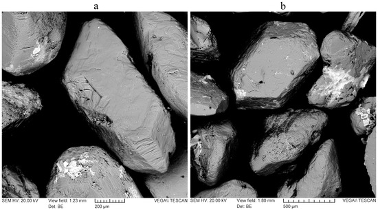 The mass of fractions 0.25–0.1 and 0.1–0.05 mm after washing, on the contrary, increased by 1.41 and 4.29 times, respectively. The insoluble residue of the 0.25–0.1 mm fraction as well as larger fractions is mainly represented by light-colored transparent and translucent rhomboidal and prismatic crystals of gypsum and fossilized quartz grains (Figure 5a, sample 152). The insignificant magnetic part of this fraction is represented by black- or brown-colored aggregates of aqueous iron oxides.