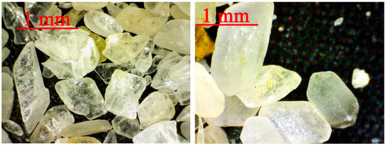 The weight of fractions 2–1, 1–0.5, and 0.5–0.25 mm decreased by 98, 90 and 60%, respectively, after washing with water. There was no reaction when 10% HCl was added. The insoluble residue of these fractions is mainly represented by light-colored transparent and translucent rhomboidal and prismatic crystals of gypsum (Figure 3 and Figure 4) with well-developed facets and pelletized quartz grains. The shape of the gypsum crystals and the absence of traces of mechanical transport on their facet surfaces, as well as the paragenetic association with halite, indicate its authigenic origin [39]. The facet surfaces of gypsum crystals do not have traces of dissolution and recrystallization and do not contain inclusions of other mineral phases, which indicates the absence of late diagenetic transformations. Differences in the morphology of gypsum crystals may be related to the growth rate, or to changes in the chemical composition of mud water [40,41,42]. The good roundness of quartz grains is a consequence of their transportation from the catchment surface. In addition to light-colored aggregates, brown-black and brown aggregates of aqueous iron oxides in association with halite are very rare in the insoluble residue of these fractions.