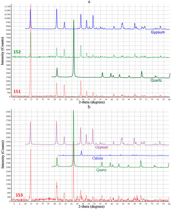 Diffractograms of insoluble residue of self-sedimented salt ((a), sample 151) and fractions 0.25–0.1 mm ((a), sample 152) and 0.1–0.05 mm ((b), sample 153) of bottom sediments of Lake Baskunchak. The diffractograms of the identified mineral phases from the radiographic database PDF-2 are given.