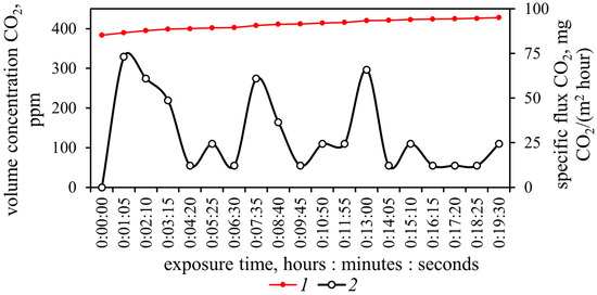 The course of the volume concentration CO2 in the storage trap chamber (1) and its specific flux to the atmosphere (2), June 2024, during the exposure period in Lake Baskunchak.
