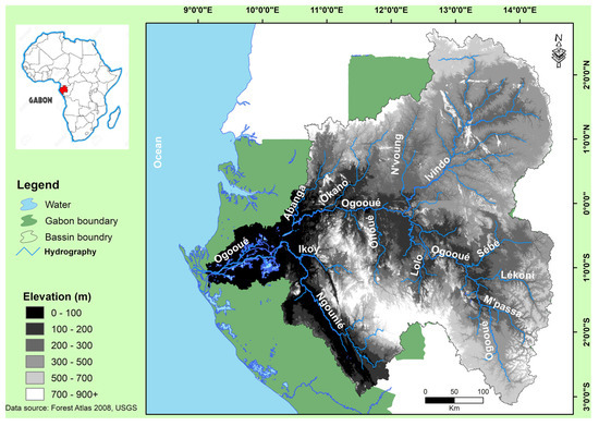 The topography of the Ogooué basin is characterized by varied relief, influenced by the geological history of the region [48]. There are plateaus, mountain ranges, plains, and valleys shaped by millions of years of erosion and tectonic activities. The plateaus cover a large part of the basin, with altitudes generally around 450 m above sea level (masl) [49]. They are formed of ancient rocks and are often covered by dense forests. The basin is home to several mountain ranges, the most important of which are the Chaillu to the east and the Cristal Mountains to the west [50]. These massifs rise to more than 1000 masl and feature steep landscapes and mountain forests. In the basin, there are alluvial plains along the major rivers, notably the Ogooué and its main tributaries. These plains are generally fertile and are often occupied by agricultural areas.