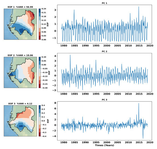 Precipitation variability in the ORB is a complex phenomenon that requires a multidisciplinary approach to be better understood. The principal component analysis (PCA) is a powerful statistical technique used to reduce the dimensionality of a dataset while retaining as much information as possible [67]. In the context of precipitation, it makes it possible to transform a large number of rainfall variables (monthly rainfall at each node of a grid, for example) into a smaller number of uncorrelated variables called Principal components (PCs) [68,69]. The results of PCA in the ORB MSWEP V2 rainfall data over the period from 1979 to 2018 are shown in Figure 2. Only the first three principal components corresponding to approximately 80% of the total variance of these rainfall data are presented by their Empirical Orthogonal Factors (EOF) and the associated temporal PCs. Furthermore, all other modes correspond to explained variances around 1 or below.