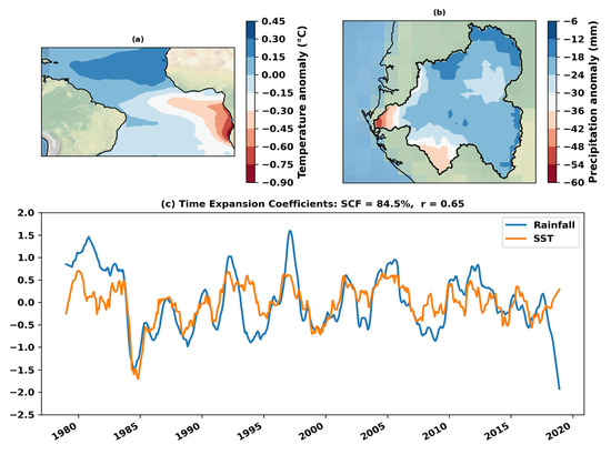 Figure 3 shows the MCA-derived coupled patterns of SST in the Atlantic Ocean and rainfall in the ORB. The Atlantic SST pattern presents a strong signal along the coastal eastern equatorial area, with an extension along the Equator. Because of the similarities with the ENSO phenomenon in the Pacific, this pattern is often referred to as Atlantic Niño [71,72,73]. Considering the opposite SST anomalies on the northern part, along the coasts of Senegal and Mauritania, with a large expansion offshore, the whole tropical Atlantic pattern is more similar to the Atlantic Meridional Mode (AMM) [74,75,76]. The ORB rainfall pattern shows negative anomalies in the entire basin, with strong anomalies in the coastal region of the basin and decreasing anomalies upstream. These coupled patterns denoted the co-variation in rainfall in the whole ORB and SST in the tropical Atlantic Ocean, especially in the southeastern equatorial area. In addition, the squared covariance fraction for this maximum covariance pattern is 84%, denoting that the link between tropical SST in the Atlantic Ocean and rainfall in the ORB is almost totally represented in this first mode. Figure 3c shows the Time Expansion Coefficients (TEC) associated with the two SST-rainfall patterns. Both time series were filtered based on the Savitzky–Golay filter with 1-year window size to extract high-frequency noises that can hinder the correlation of these signals [77,78,79]. The computed Pearson correlation of both TECs is 0.69 (p-values < 0.05), significant at a 95% confidence level.