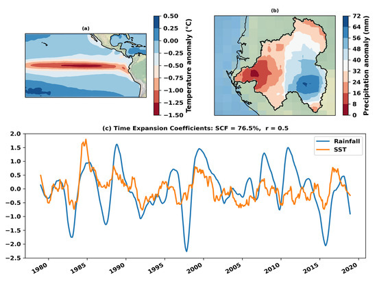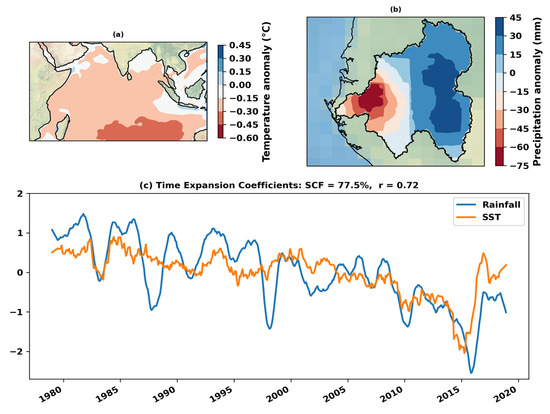 Figure 5 shows coupled patterns of SST in the tropical Indian Ocean and rainfall in the ORB. The associated Indian Ocean SST presents positive SST anomalies in almost the entire tropical Indian Ocean, with slightly stronger SST anomalies to the southeast of the ocean basin. Inversely, the associated ORB rainfall pattern shows positive (negative) anomalies in the east (west) of the ORB. This result is in agreement with those of other authors who have shown that variations in spring and autumn rainfall on the west coast of equatorial Africa, including the ORB, are influenced by SST throughout the whole tropical Indian Ocean [30,31]. Both patterns denote increasing (decreasing) rainfall in the east (west) of the ORB, related to positive SST anomalies in the tropical Indian Ocean. This first MCA mode between rainfall in the ORB and SST in the tropical Indian Ocean almost embeds the overall co-variation in these two geophysical fields, as its SCF is 77%. The TECs associated with these coupled patterns were filtered using the Savitzky–Golay filter with a 1-year window size and represented in Figure 5c. The computed Pearson correlation of both of these TECs resulted in 0.73 (p-value < 0.05), significant at a 95% significance level.