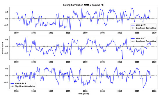 Moving correlation between AMM and the leading temporal PCs of rainfall in the ORB. Blue lines show 12-month rolling correlations with the principal components derived from the three leading EOFs. Gray dots indicate statistically significant correlations.