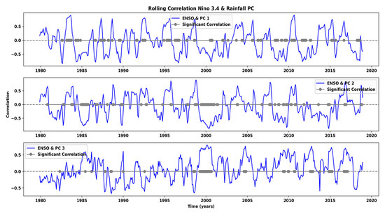 Moving correlations between ENSO and leading temporal PCs of rainfall in the ORB. Blue lines show 12-month rolling correlations with the principal components derived from the three leading EOFs. Gray dots indicate statistically significant correlations.