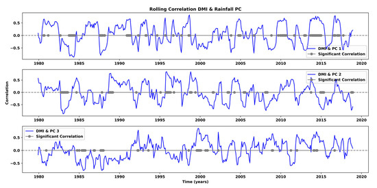 Moving correlations between IDM and leading temporal PCs of rainfall in the ORB. Blue lines show 12-month rolling correlations with the principal components derived from the three leading EOFs. Gray dots indicate statistically significant correlations.