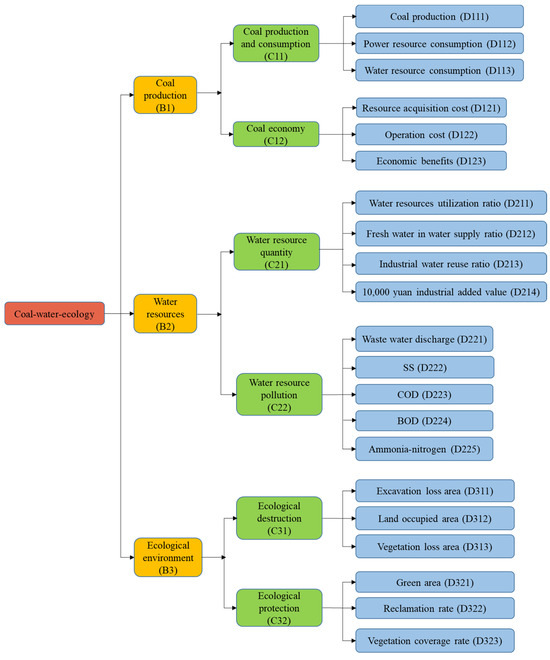 - Coal production and consumption, the coal economy, the water resource quantity, water resource pollution, ecological destruction, and ecological protection are considered as a whole to establish a CWE index system. The index system includes 21 indices from six aspects and three dimensions. The target layer is the coordinated development of coal, water, and ecology. The criterion layer has three dimensions of coal production, water resources, and the ecological environment.