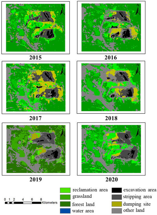| Land Use Type | Reclamation Area | Grassland | Forest Land | Other Land | Water Area | Excavation Area | Stripping Area | Dumping Site | |
