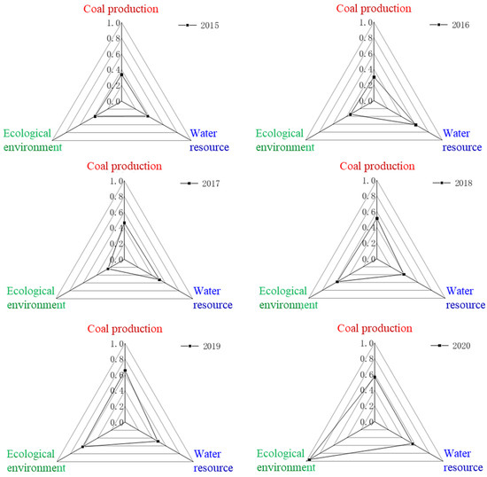 - The TOPSIS model and coupling coordination degree model can successfully characterize the coordinated development of CWE system factors. The development level of coal production and consumption in the study area is unstable. The development level of the coal economy basically shows an upward trend. The development level of water resources shows a fluctuating state. The development level of water pollution is improving year by year. The ecological environment is gradually improving. On the whole, the development level of the CWE system in the study area shows an obvious improvement trend.