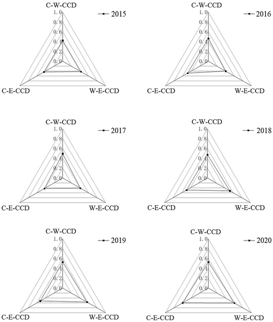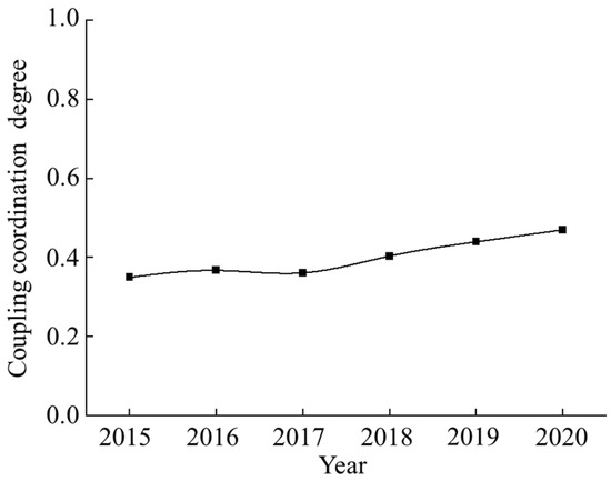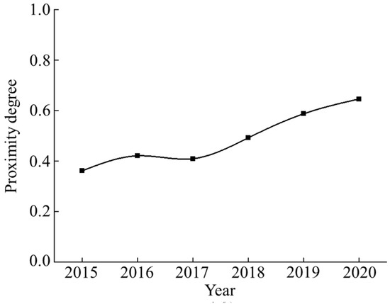 - The proximity degrees of the CWE system in the study area from 2015 to 2020 are 0.36, 0.42, 0.41, 0.49, 0.59, and 0.65, respectively, showing an increasing trend year by year, and the development level of the system is improving year by year. The coupling degree of CWE coordination is 0.35, 0.37, 0.36, 0.40, 0.44, and 0.47, respectively, with an average value of 0.4, which indicates little coordination. The degree of coupling coordination increases slowly year by year, and the degree of coordination is being gradually improved, but there is still some room for improvement.