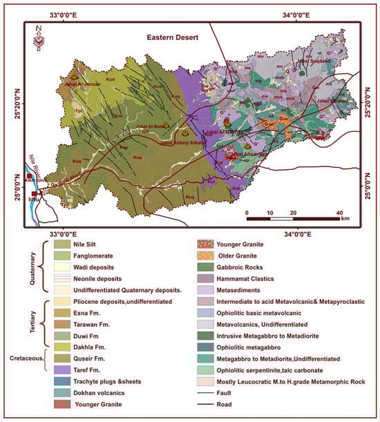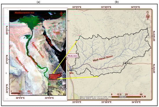 The study area covers approximately 6000 km2 in the southern part of the Egyptian Eastern Desert, extending in a NE-SW direction along the Idfo-Marsa Alam Road [62]. It is geographically located between longitudes 32°50′00″ and 34°05′00″ East and latitudes 24°53′00″ and 25°34′00″ North, east of Idfo in the Nile Valley (Figure 1). The region features an arid climate, with an average annual rainfall of approximately 25 mm, and is occasionally subject to infrequent flash floods. Geologically, the dominant rock units in Wadi Abadi range from Precambrian to Recent age.