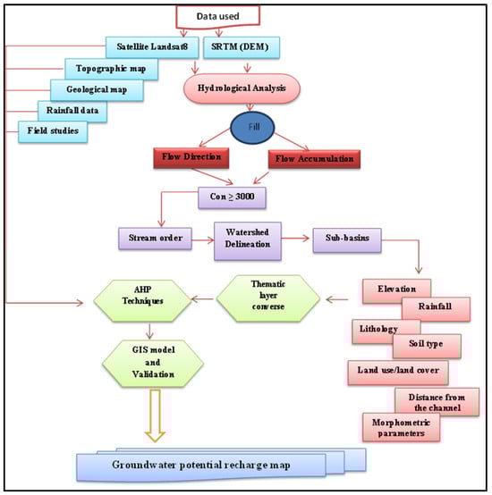 Currently, GIS is a promising tool, especially when combined with remote sensing, for calculating various aspects of morphometry. Many researchers have recently utilized RS, GIS and AHP techniques to evaluate morphometric parameters, demonstrating their effectiveness for drainage basin analysis and societal applications [33,34,35,36,37,38,39,40]. GIS-based evaluations using Shuttle Radar Topographic Mission (SRTM) data enhance the efficiency and accuracy of hydrological analyses, contributing to improved groundwater management strategies. Refs. [41,42,43,44] used the AHP method within a GIS tool to develop a geographic model for the Bastora river basin’s sub-watershed, utilizing 14 morphometric parameters. Furthermore, the use of GIS tools is the most effective and integrated method for identifying potential groundwater recharge zones [45,46,47,48,49,50,51,52,53]. Numerous studies have indicated that effective groundwater management plans within watersheds require detailed information on various morphometric parameters, such as the bifurcation ratio (Rb), drainage density (Dd), drainage texture (Dt), and the elongation ratio (Re) to determine appropriate recharge locations and prospective zones for groundwater recharge [54,55,56].