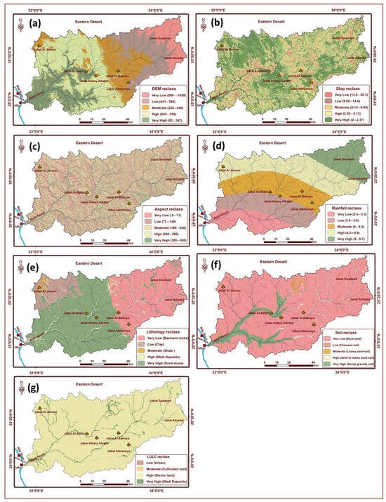 (a) Digital elevation model; (b) slope; (c) aspect; (d) rainfall distribution; (e) lithology; (f) soil types; and (g) LULC.