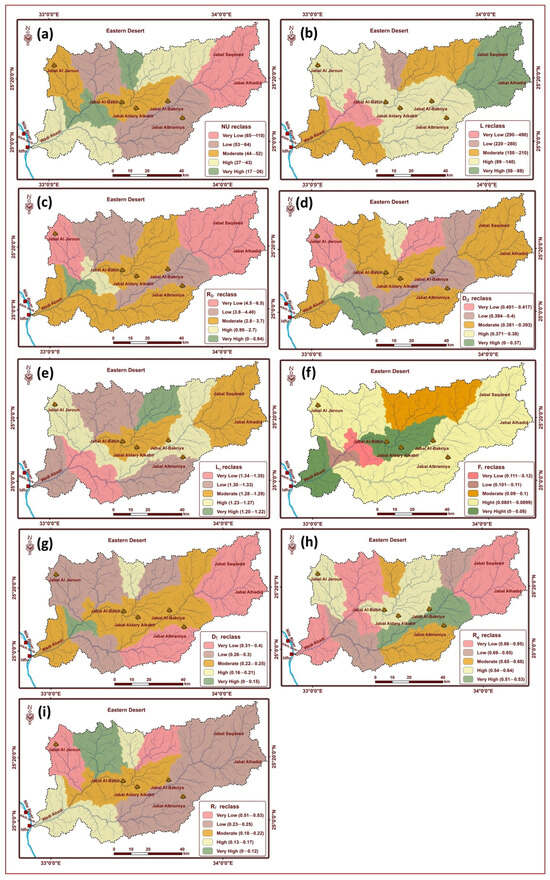 (a) Stream order and number; (b) stream length; (c) bifurcation ratio; (d) drainage density; (e) length of overland flow; (f) stream frequency; (g) drainage texture; (h) elongation ratio; and (i) relief ratio.
