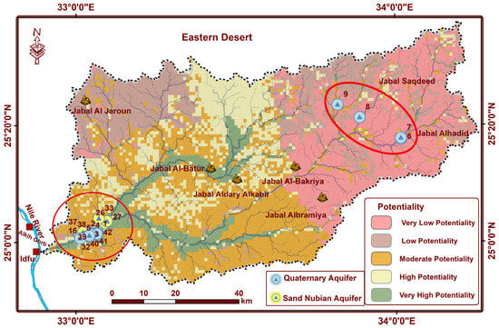 Wadi Abadi Basin in the Egyptian Eastern Desert presents a typical case of such a challenging arid environment. Characterized by limited rainfall, high evaporation rates, and complex geological formations, this basin exemplifies the difficulties faced in groundwater exploration and management in arid regions. Wadi Abadi is one of the most potential wadis in the Egyptian Eastern Desert for development and reclamation. It covers an area of approximately 6000 km2. It is situated in the southern part of the Eastern Desert, east of Idfu City, Egypt. Numerous studies have investigated the hydrogeological conditions of Wadi Abadi and evaluated groundwater aquifers for potential development. For instance, ref. [5] proposed various development scenarios, while [6] developed a hydrological model to calculate groundwater recharge rates of alluvial aquifers from sporadic precipitation in the Red Sea hills, notably during the 1994 rainstorm events. Other studies [5,7,8,9,10,11,12,13] have utilized remote sensing and geographical information systems (GIS) to create hydrological potential maps.
