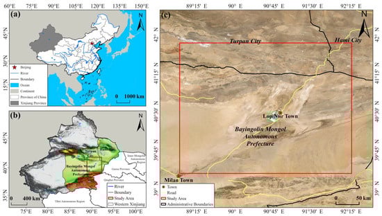 Location map of the area around Lobo Salt Flats: (a) China’s position in the world; (b) location of the study area in China; (c) remote sensing images of the study area.