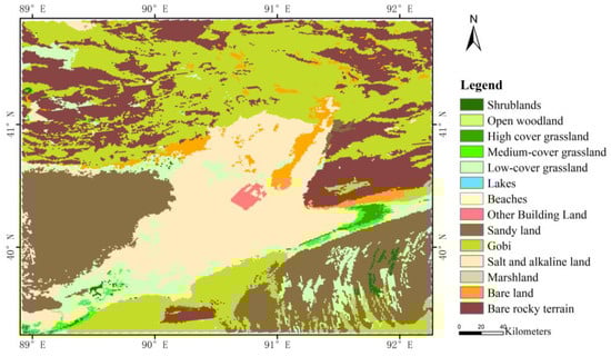 As shown in Figure 2, the research area has 14 land use types. They are shrublands, open woodland, high-cover grassland, medium-cover grass-land, low-cover grassland, lake, beach, other building land, sandy land, Gobi, slat and alkaline land, marshy land, bare land, and bare rocky terrain. The land use type is dominated by sandy land in the southwestern and southeastern part of the study area, Gobi and bare rocky texture in the northern part, and slat and alkaline land in the central area where the salt fields are located.