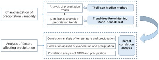 As illustrated in Figure 3, the study primarily focused on analyzing the characteristics of precipitation changes and the factors influencing precipitation in the study area. A combination of the Theil–Sen median method and the trend-free pre-whitening Mann–Kendall test was employed to analyze the characteristics of precipitation changes and classify precipitation trends. To examine the factors influencing precipitation, partial correlation analysis was conducted to evaluate the relationships between temperature, evapotranspiration, and NDVI with precipitation, individually.