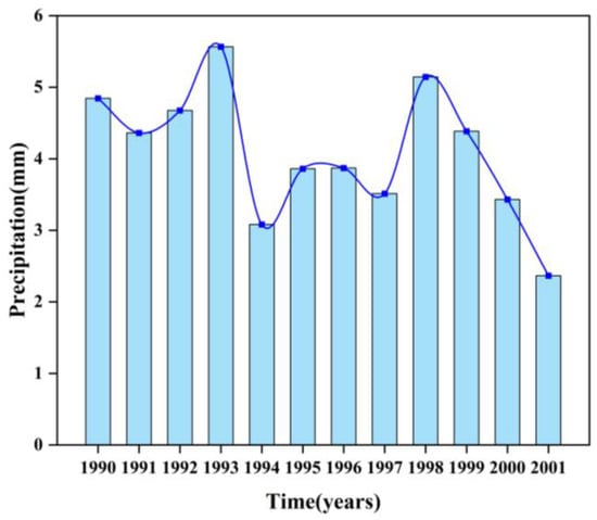 Figure 4 shows the precipitation data for the study area between 1990 and 2001 prior to the large-scale construction of salt pans. The annual precipitation during this period fluctuated between 2.37 and 5.57 mm/year, with the lowest value recorded in 2001 at 2.37 mm, and the highest in 1993 at 5.57 mm. Over the 12 years from 1990 to 2001, there was one year with 2–3 mm precipitation, five years with 3–4 mm precipitation, four years with 4–5 mm precipitation, and two years with 5–6 mm precipitation. As shown in Figure 4, while there was some fluctuation in precipitation from 1990 to 2001, the overall trend shows a decrease.