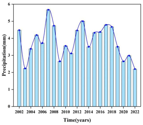 The annual precipitation statistics histogram (Figure 5) from 2002 to 2022 showed that the annual precipitation in the study area fluctuated between 2.20 and 5.67 mm/year. The lowest annual precipitation was recorded in 2022 with 2.20 mm, while the highest occurred in 2007 with 5.67 mm. Peaks of annual precipitation were observed in 2007, 2013, and 2017. Out of the total 21 years from 2002 to 2022, there were 5 years with precipitation ranging 2–3 mm, 6 years with precipitation ranging 3–4 mm, 8 years with precipitation ranging 4–5 mm, and 2 years with precipitation ranging 5–6 mm. Annual precipitation was predominantly concentrated in the range of 3–5 mm.