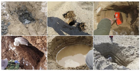 The research area is dominated by the Yardang landscape with an arid climate and scarce precipitation. Lop Nor completely dried up in 1962, and its groundwater system underwent a transformation from a once unified pool of surface and groundwater to several relatively independent groundwater systems [44]. There is no surface water system in the research area, only many dry riverbeds, alluvial gullies, and alluvial fans formed at the lake entry point, with a small amount of flood water recharge during summer floods [45].