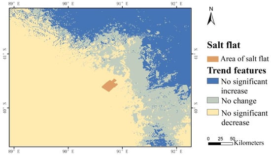 The Lobo region is located in the eastern part of the Taklamakan Desert. As shown in the map of land use types, the research area that showed a decreasing trend is mainly the Taklamakan Desert area. The desert region has a long period of drought and harsh climatic conditions, and salt fields have less impact on its climate. Thus, it showed a non-significant downward trend, as shown in the figure.