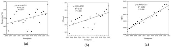 Figure 9 illustrates the variations in annual mean temperature, ET, and NDVI in the research area over the span of 21 years, which were obtained by analyzing the time series data using one-way linear regression.
