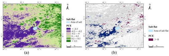 Figure 10a shows the partial correlation coefficients between temperature and precipitation. A partial correlation coefficient greater than 0 indicates a positive correlation, while less than 0 indicates a negative correlation, and the larger the absolute value, the stronger the correlation. The partial correlation coefficients between precipitation and temperature are divided into six levels with the boundaries of −0.3, −0.2, 0, 0.2, and 0.3. As shown in Figure 10a, there are differences in the correlation between precipitation and temperature in the research area with positive correlation dominating in the western region and negative correlation dominating in the eastern region. The positive correlation area has a certain stratification phenomenon, i.e., the closer to the western part of the research area, the more obvious the positive correlation. The area corresponding to each level is shown in Table 1.