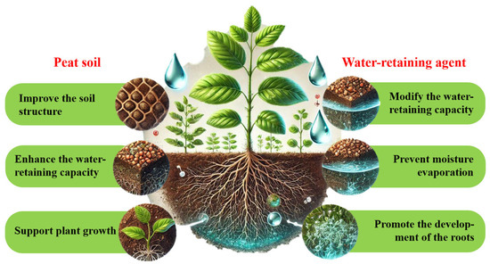Organic matter is rich in peat soil, and incorporation of the peat soil can significantly enhance the physical structure of the modified soil. Additionally, peat soil has excellent water retention capabilities, allowing it to absorb and store substantial amounts of moisture. This property helps soil maintain relatively moist conditions during droughts, thereby conserving water. Furthermore, peat soil enhances soil aeration and drainage, while providing long-term nutrients essential for plant growth [13,14]. Water-retaining agents, composed of polymeric materials, can absorb and retain a significant amount of water, thereby improving the soil’s water retention capacity. In addition, these agents can form a sponge-like structure within the soil, effectively reducing water evaporation and deep percolation. Therefore, soil moisture is retained in the root zone for a longer period, and water loss is minimized. In any case, the presence of water-retaining agents enhances soil stability, reduces soil compaction, and promotes root development [15,16]. The mechanisms by which peat soil and water-retaining agents promote soil vegetation growth are illustrated in Figure 2.