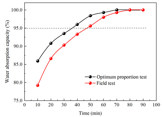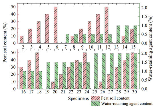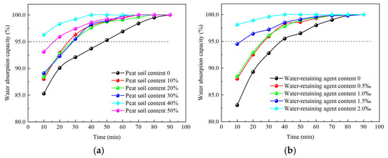 As shown in Figure 8, it is evident that a higher content of peat soil results in a faster water absorption capacity. When the content of peat soil exceeded 10%, the water absorption capacity of the modified soil could reach 95% within 30 min; when the content of peat soil exceeded 40%, the water absorption capacity could reach 95% within 20 min. A higher content of the water-retaining agent results in a faster water absorption capacity. When the water-retaining agent content exceeded 0.5‰, the water absorption capacity of the modified soil could exceed 95% within 30 min; when the content exceeded 1.5‰, the water absorption capacity could exceed 95% within 20 min.
