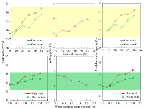 Figure 6 depicts the relationship between field capacity and wilting point in the modified soil, under conditions of varying proportions of peat soil and water-retaining agent. As the content of peat soil increased, the field capacity of the modified soil exhibited an upward trend, thereby facilitating increased water storage for plants. Moreover, the wilting point of the modified soil increased with rising peat soil content. As the wilting point signifies the lower limit of water content available to plants, its increase negatively impacts the availability of water for plant use. Notably, the absolute increase in the wilting point was less than that of the field capacity. Specifically, when the peat soil content increased from 0 to 50%, the wilting point rose from 3.7% to 5.9%. One week after sampling, the field capacity of the modified soil increased from 38.0% to 52.2%. Consequently, as the peat soil content increased, the available water capacity of the modified soil also improved. The reduction in moisture constants observed two months after sampling, as illustrated in Figure 6, may be attributed to the compaction of the modified soil over time.