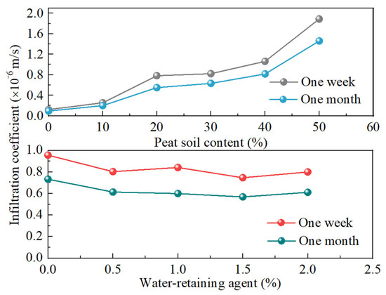 As the content of the water-retaining agent increased, the infiltration coefficient of the modified soil showed a decreasing trend. This is primarily because the water-retaining agent absorbs water, converting it into non-flowing water that adheres to the agent. This reduces the soil’s porosity to some extent, thereby lowering the infiltration coefficient. However, the reduction was less significant compared to the impact of peat soil. When the water-retaining agent content increased from 0 to 2.0‰, the infiltration coefficient of the modified soil decreased from 0.95 × 10−6 m/s to 0.80 × 10−6 m/s, representing a reduction of 16% after one week.