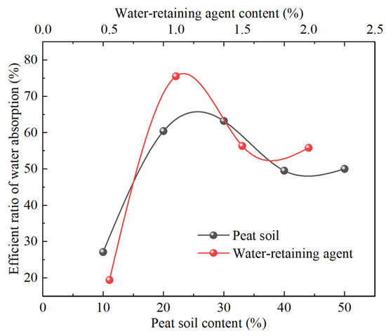 In addition to the technical factors previously mentioned, economic considerations also need to be accounted for in determining the reasonable proportion of modified soil. While the incorporation of peat soil and water-retaining agents can enhance the available water capacity of the soil, the full potential of these additives’ water absorption and storage capabilities may not be fully realized. According to water absorption tests, the selected peat soil for this optimum proportion test can absorb water three times its weight, whereas the water-retaining agent can absorb water 65 times its weight. Nevertheless, the inherent constraints imposed by the modified soil limit the extent to which the water absorption capacity of the added peat soil and water-retaining agents can be effectively utilized. The water absorption efficiency of peat soil (or water-retaining agent) is defined as the ratio of the water absorbed by the peat soil (or water-retaining agent) in the modified soil, relative to its inherent water absorption capacity, expressed as a percentage. Figure 8 illustrates the relationship between the water absorption efficiency of peat soil in modified soil and the content of peat soil. Similarly, Figure 9 depicts the relationship between the water absorption efficiency of the water-retaining agent in modified soil and its content.