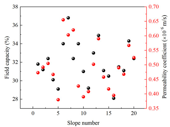 As depicted in Figure 11, the field capacity of the modified soil, as determined through field tests, ranges from 28.1% to 36.8%, with an average value of 31.9%. A reduction of 23% was observed in the soil’s field capacity, which was measured at 41.5% as determined by the optimum proportion test. The infiltration coefficient of modified soil in the field tests ranges from 0.38 × 10−6 m/s to 0.66 × 10−6 m/s, with an average of 0.49 × 10−6 m/s. There was a reduction of 27% compared to the 0.67 × 10−6 m/s infiltration coefficient of the optimum proportion test.
