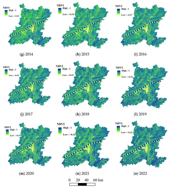where, NIR represents the reflectance in the near-infrared band, and R represents the reflectance in the red light band. The NDVI ranges from −1 to 1, with higher values typically indicating denser vegetation. NDVI is a standardized method for assessing vegetation health. Higher NDVI values generally correspond to healthier vegetation, while lower NDVI values indicate sparse or no vegetation. Specifically, an NDVI value close to 1 signifies well-covered and healthy vegetation, an NDVI value close to 0 indicates a lack of vegetation, which may be bare soil or water bodies, and negative values are usually associated with non-vegetated areas such as deserts or snowfields.