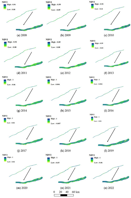 Furthermore, this study computed the average NDVI for 15 years across the 20 test sites, as shown in Figure 17c. Aside from the severe drought in 2011, the area primarily features sparse herbaceous vegetation. Overall, the NDVI trend is positive and shows a gradual increase. Between 2008 and 2016, NDVI values increased from 0.145–0.712 to 0.165–0.771. Subsequently, NDVI levels at the test sites progressively reached healthier levels, and by 2022, they even achieved a value of 0.67. Over the past 15 years, the average NDVI value of the region has experienced significant changes, gradually increasing from an initial value of 0.52 in 2008 to a higher level. The trajectory of the average NDVI value indicates an overall upward trend, with an accelerated growth rate observed especially after 2018. However, this growth trend was not always smooth, as fluctuations occurred due to external factors, such as a severe drought in 2011. Despite the occurrence of two droughts over the past 15 years, the standard deviation remained relatively stable, suggesting a degree of resilience in the system. Nonetheless, this observation does not directly imply that the climate was generally stable, as other factors may have influenced the variability.