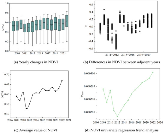 where n represents the total number of years; NDVIi denotes the mean of NDVI for the i-th year; and is the slope of the trend line.