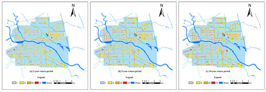 Waterlogging hazard assessment map under different rainfall scenarios of study area.