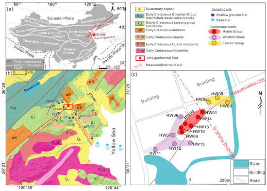 (a) The tectonic location of the Jimo geothermal system; major tectonic units in China, modified from [46]. (b) Lithologies and tectonics of the study area and sampling sites of shallow groundwater and seawater [23,43]. (c) Sampling locations of geothermal water.
