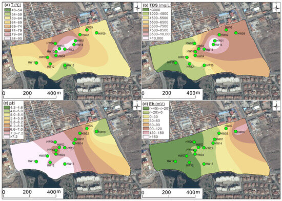 Spatial patterns of the wellhead temperature (T°C) (a), TDS (mg/L) (b), pH (c) and Eh (mV) for geothermal water (d).