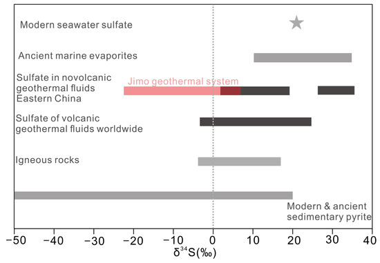 Comparison of δ34S values for sulfate (red line) in Jimo geothermal water with those of sulfides and sulfate in various geologic reservoirs. The δ34S values for sulfides of igneous rocks and modern and ancient sediments, and sulfate of ancient marine evaporites are shown as gray lines [29,30,51,53,54]. The black lines indicate previously reported δ34S values for dissolved sulfate in volcanic geothermal water worldwide [25,50,55,56] and nonvolcanic geothermal water in east China [2,26]. The star symbol represents the δ34S value for dissolved sulfate in modern seawater.