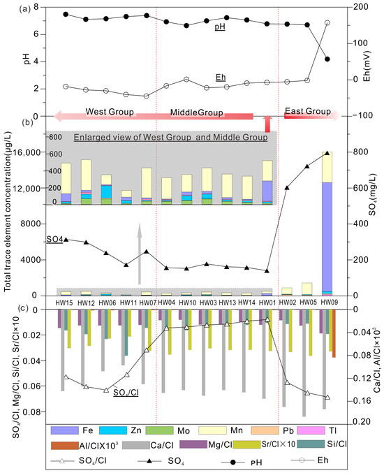 Hydrochemical characteristics and distribution of geothermal water in the Jimo Basin, including (a) pH and Eh; (b) total trace element and SO42− concentrations; and (c) Sr/Cl, Si/Cl, Al/Cl, Ca/Cl, Mg/Cl and SO4/Cl molar ratios.
