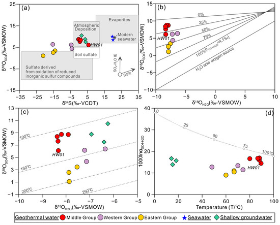(a) Plot of δ34SSO4 vs. δ18OSO4 for sulfate in Jimo geothermal waters, shallow groundwater and seawater. Endmembers of atmospheric deposition, soil, seawater, evaporites and oxidation of reduced inorganic sulfur compounds are shown for reference [28,51,52]. Secondary processes include (1) bacterial sulfate reduction (BSR) and (2) oxygen isotope exchange between SO4 and H2O (SO4-H2O IE). BSR causes isotope fractionation, enriching δ18OSO4 and δ34SSO4 in the residual sulfate with the ratio of 1:4 [35,36]. Plots of δ18OSO4 vs. δ18OH2O, (b–d) 103lnαSO4-H2O vs. wellhead temperature. The evolution of δ18OSO4, δ18OH2O and 103lnαSO4-H2O with temperature is based on 103lnα = 3.251 × 106/T2−5.6 [16].
