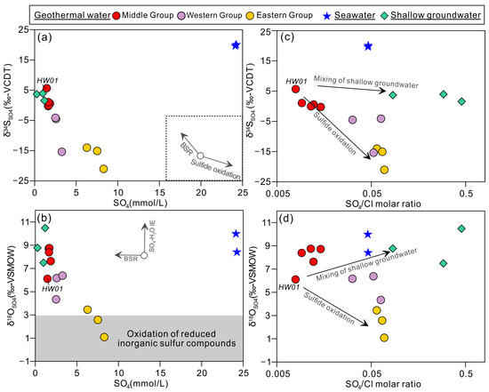 Western Group geothermal waters exhibit large variations in δ34SSO4 values and relatively constant δ18OSO4 values (Figure 5). This cannot be explained by a dominant single source (e.g., atmospheric precipitation or oxidation of sulfide minerals) or the influence of bacterial sulfate reduction, which generally results in a 1:4 kinetic relationship between the δ18OSO4 and δ34SSO4 of sulfate [35,36]. The δ34SSO4-δ18OSO4-SO4-SO4/Cl relationship suggests both the influence of sulfide oxidation and mixing of shallow groundwater with low SO42− concentrations but higher δ34SSO4 values and SO4/Cl ratios (Figure 6), which is consistent with the explanation of geochemical characteristics in Section 5.1. Due to the involvement of multiple metal sulfides and the significant influence of shallow groundwater, it is challenging to identify sulfide oxidation pathways.